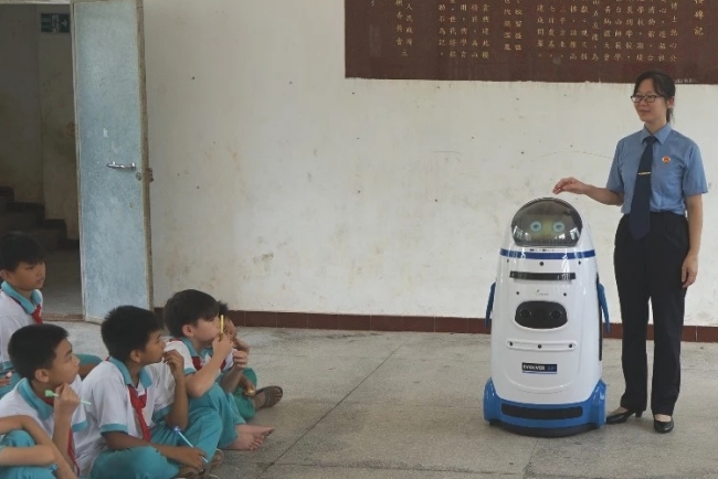 谭绮梅带着法治机器人在隆文学校讲授法治课。