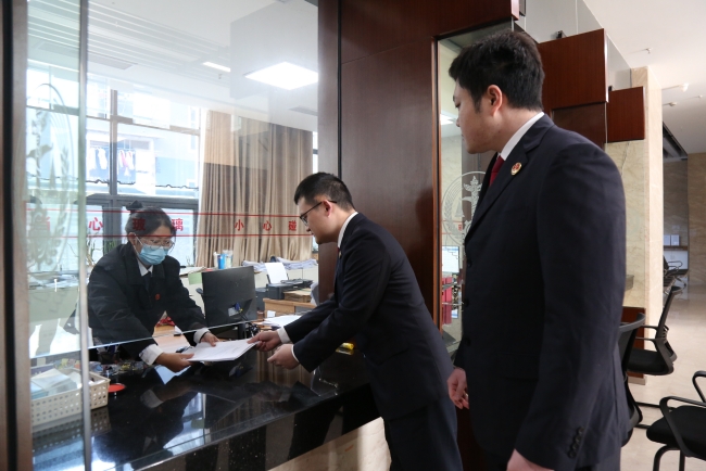 吴迪(中)和办案组成员一同到法院调取案件相关材料。